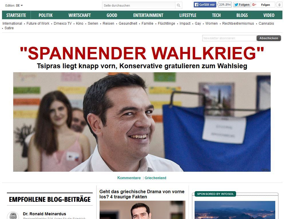 "Μπροστά ο ΣΥΡΙΖΑ σύμφωνα με τα προγνωστικά", αναφέρει σχετικό άρθρο στην ηλεκτρονική έκδοσή του το Spiegel και σημειώνει: "Ο Αλέξης Τσίπρας ήθελε μια δεύτερη ευκαιρία και οι Έλληνες προφανώς του τη δίνουν. Σύμφωνα με τα πρώτα προγνωστικά στις πρόωρες εκλογές το αριστερό κόμμα ΣΥΡΙΖΑ έλαβε τις περισσότερες ψήφους. Η συντηρητική ΝΔ όμως ακολουθεί σε απόσταση αναπνοής".