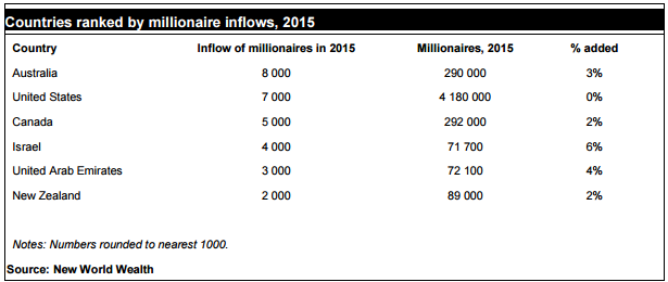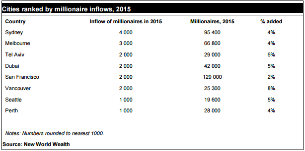 Όπως διαφαίνεται από τα στοιχεία της έρευνας, οι πόλεις με τις μεγαλύτερες εισροές εκατομμυριούχων το 2015, ήταν οι εξής: Σίδνεϋ, Μελβούρνη, Τελ Αβίβ, Ντουμπάι, Σαν Φρανσίσκο, Βανκούβερ, Σιάτλ και Περθ.