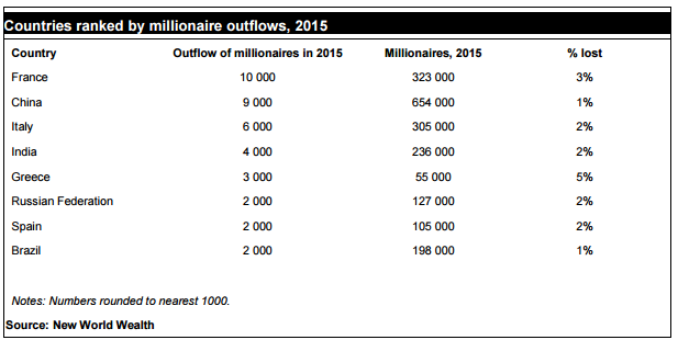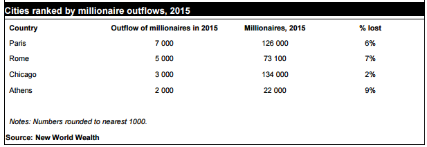 Αντίστοιχα, οι πόλεις με τις μεγαλύτερες εκροές εκατομμυριούχων ήταν το Παρίσι (7.000 εκατομμυριούχοι σε σύνολο 126.000), η Ρώμη (5.000 σε σύνολο 73.100), το Σικάγο (3.000 σε σύνολο 134.000) και η Αθήνα (2.000 σε σύνολο 22.000). Από την Αθήνα, οι περισσότεροι μετανάστευσαν στη Μεγάλη Βρετανία και τις ΗΠΑ, εξαιτίας της δεινής οικονομικής κατάστασης στην Ελλάδα αλλά και της προσφυγικής κρίσης. Από το σύνολο της Ελλάδας, τη χώρα εγκατέλειψαν οι 3.000 εκατομμυριούχοι από τους 55.000.